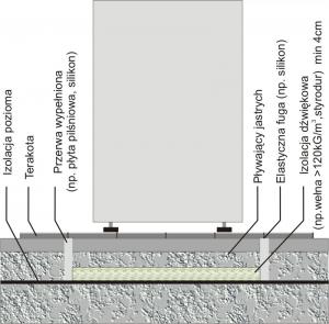 częstotliwości (200-1000Hz). Aby zapobiec przenoszeniu się drgań na konstrukcję budynku zaleca się zbudowanie "pływającego" fundamentu pod pompę ciepła wg rysunku poniżej. Warstwa wibroizolacyjna (twarda wełna, styrodur) powinna mieć co najmniej 4cm grubości.